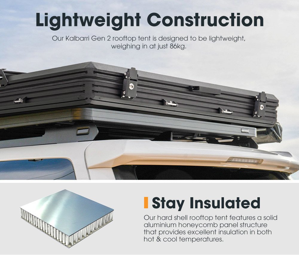 Stay Insulated: Our hard shell rooftop tent features a solid aluminium honeycomb panel structure that provides excellent insulation in both hot & cool temperatures.