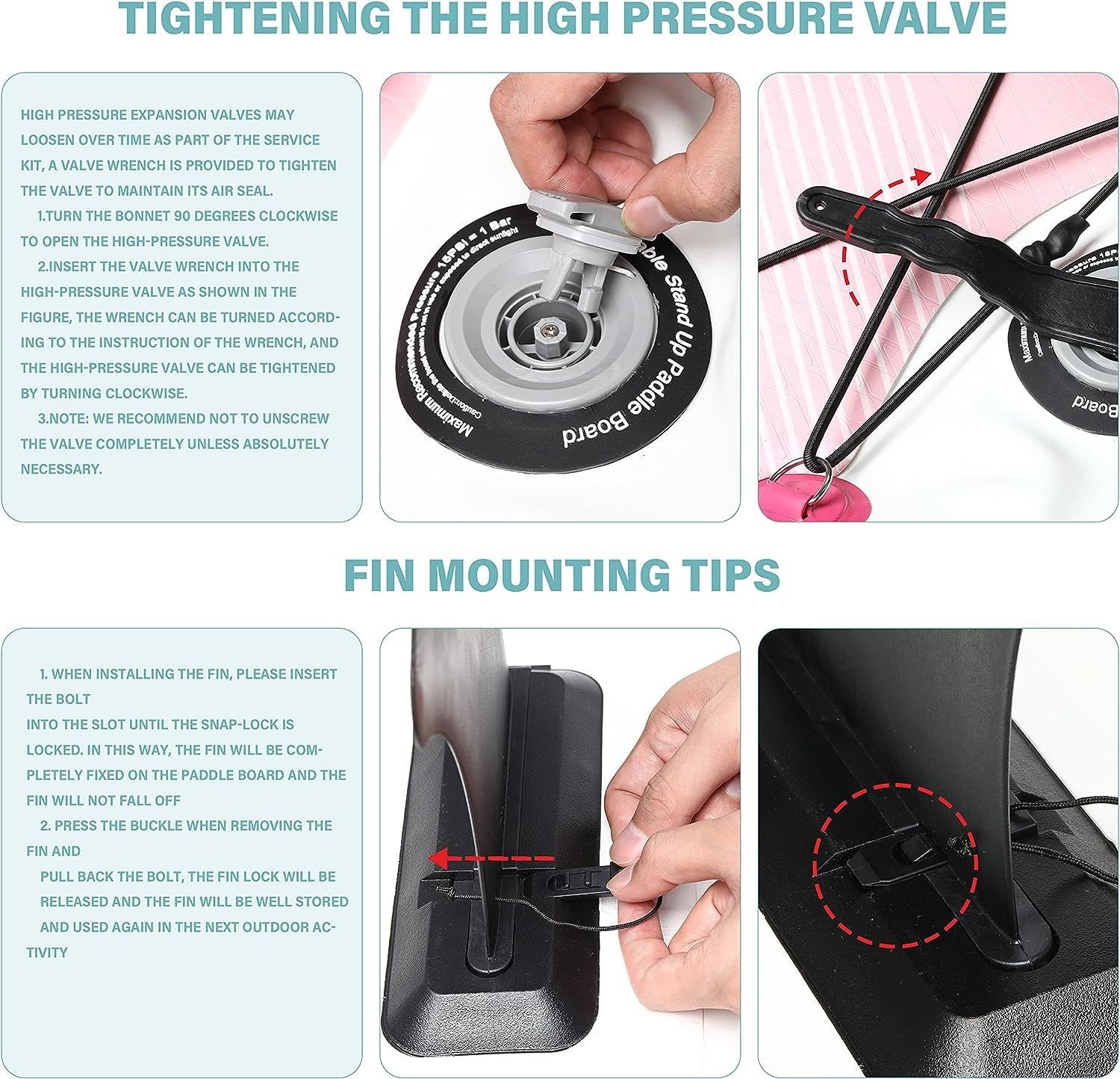 [ALL-IN-1 ACCESSORIES] The Package Includes: 1*inflatable paddle board, 3-piece length adjustable floating paddle ,1* removable fin, 1*SUP hand pump, 1*backpack, 1*leash,1* paddle hanger If you come across any high pressure valve or fin mounting issue, please refer to our instructions in the images, thanks.