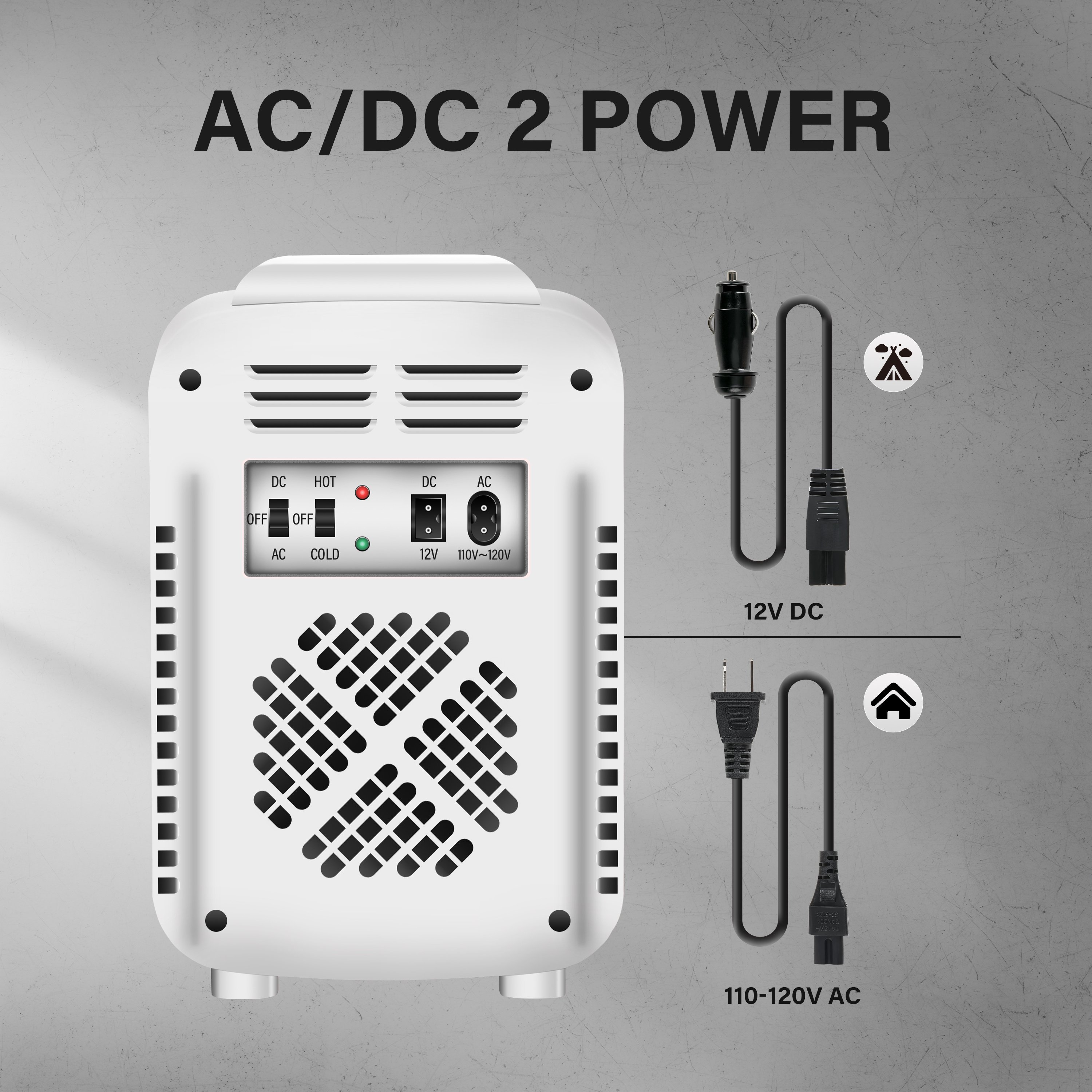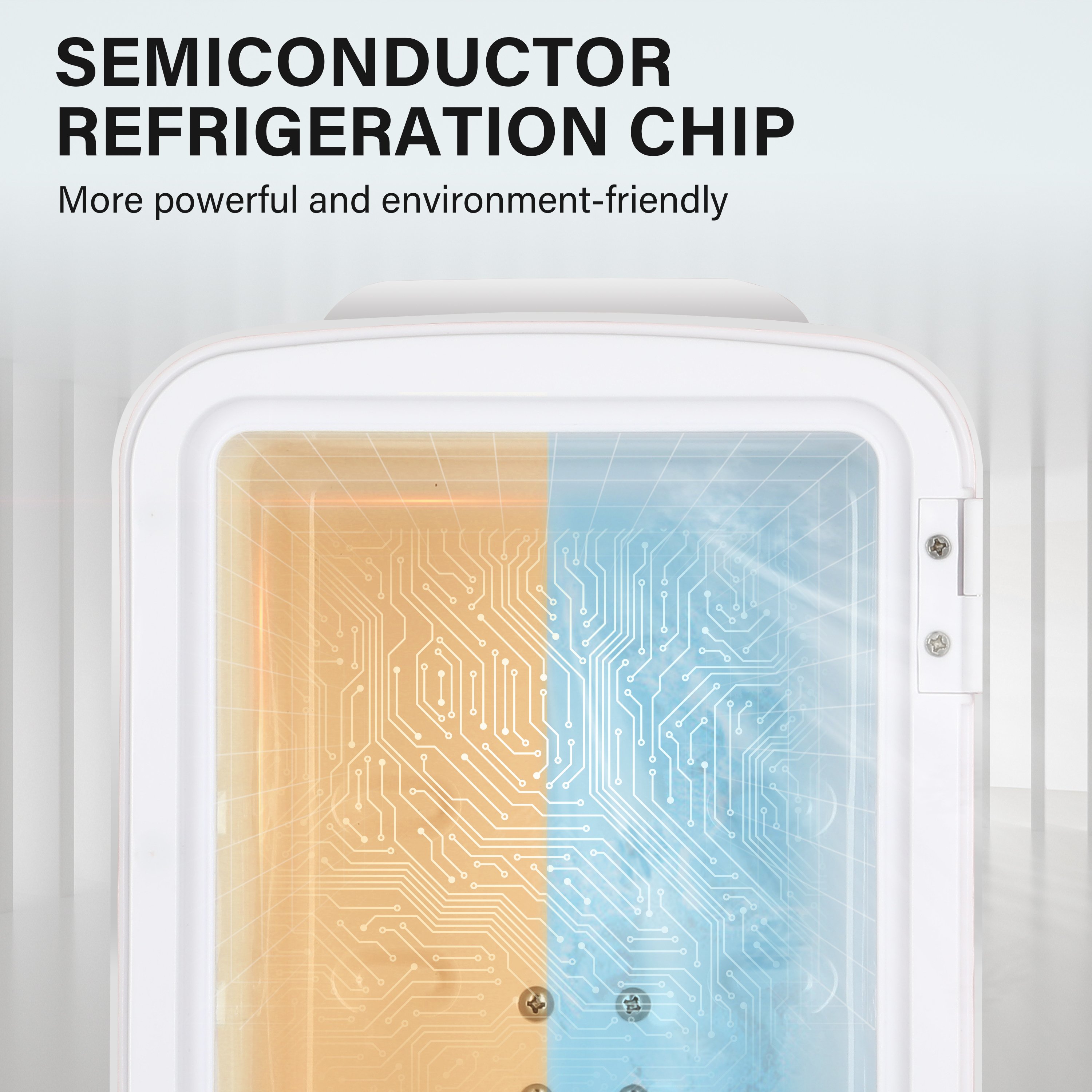 Compact and portable: 4-Liter capacity that can store up to six 12 oz cans. The interior size is 5.5*5.1*8.1 inches. Comes with a removable shelf and convenient carry handle, great for bedroom, offices, dorms, camping and more! Capacity: 4 liters Multiple functions: Set the mini fridge to cool or warm just flip a switch! Cool up to 34°F (18-20°C below ambient temperature) and keep warm up to 131°F (55°C), great for the storage food, drinks, cosmetics and skincare. An ideal gift for women Adapter: You can connect the fridge to a 100-120V home power supply, perfect for indoor and outdoor. Eco-friendly and quiet operation: 100% Freon-Free. Use advanced semiconductors that are free of CFCs and refrigerants. And the chips are more powerful, long-lasting durability and energy efficient. With the ability to perform quietly (25 dB Sleep Mode) Package include: 1*white mini refrigerator host, 2* power cord, 1*internal partition storage room shelf, 1*storage box, 1*English manual