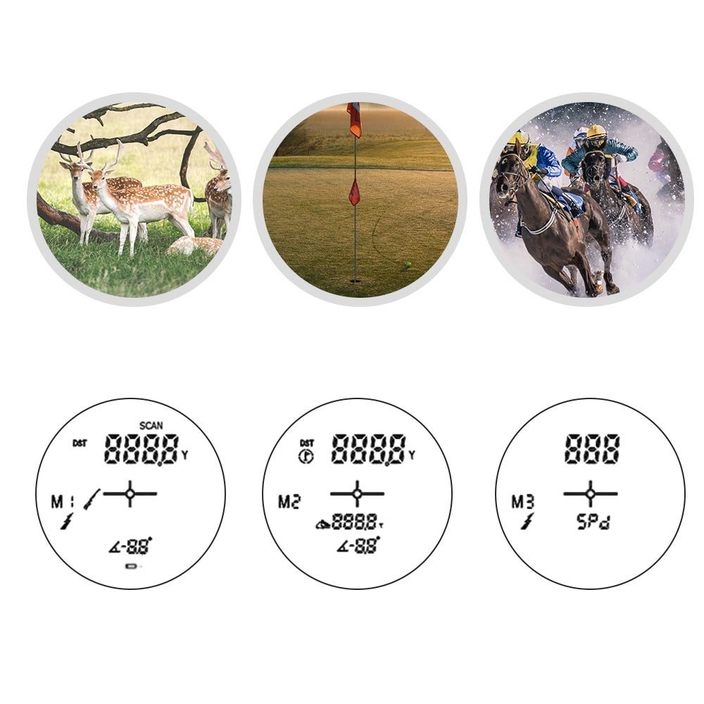 3-in-1 Multifunctional Gadget - Golf Rangefinder with 3 modes for different usages: Golf Mode as a golf pin seeker; measuring slope distance and angle; Hunting Mode for straight distance & angle measurement; Speed Mode for speed measurement; up to 300km/h; ideal for playing golf; hunting; observing birds and watching horse or car race
