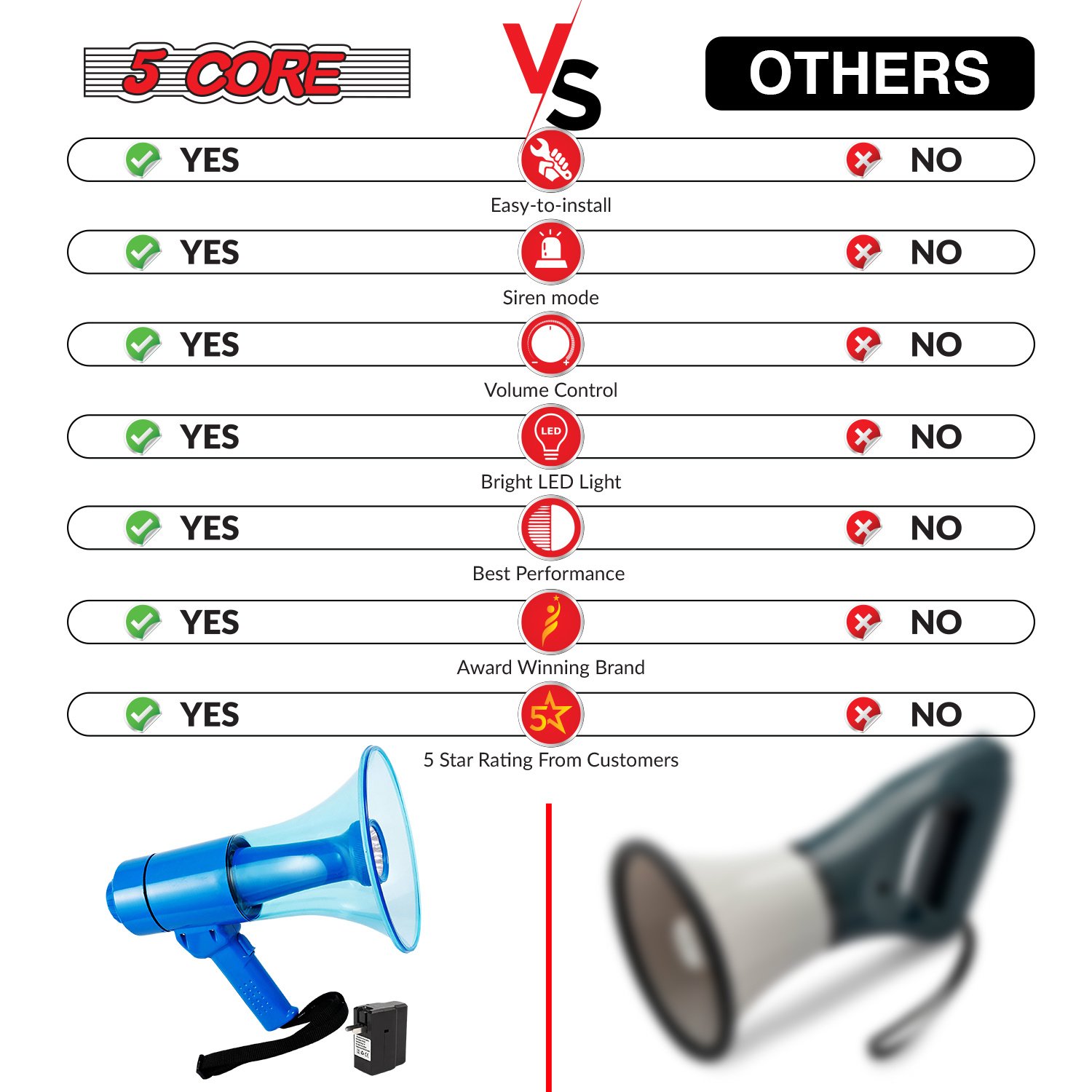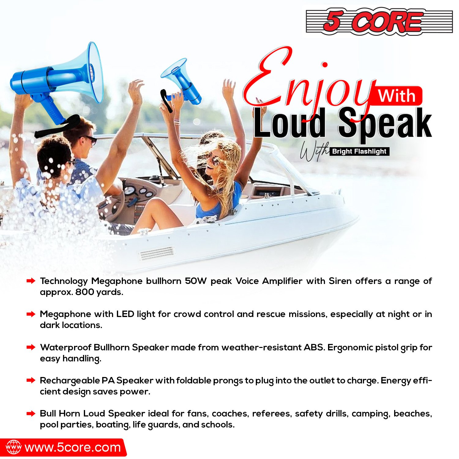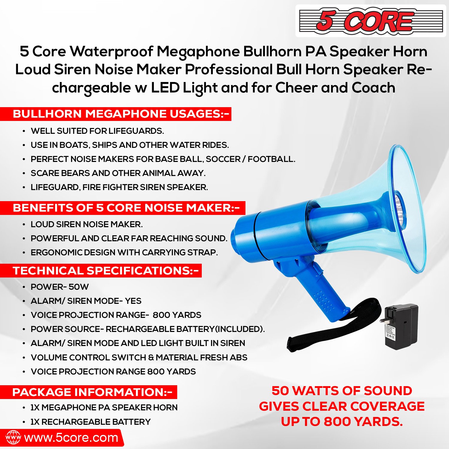 Improve your communication with this waterproof loud megaphone, featuring 50W power to effortlessly amplify your voice up to 800 yards. Engage audiences instantly with the powerful siren mode. Built from heavy-duty, waterproof ABS, it's perfect for all conditions. The built-in LED light enhances visibility in low light, and the bright light also grabs the attention of audiences. Ideal for cheerleading, sports, and more, its ergonomic design offers comfort during extended use. The light also serves as a safety feature in hazardous conditions. Lightweight and portable, this bullhorn comes with a convenient carry strap, making it very easy to take anywhere. Powered by 6 AA batteries (not included). |
