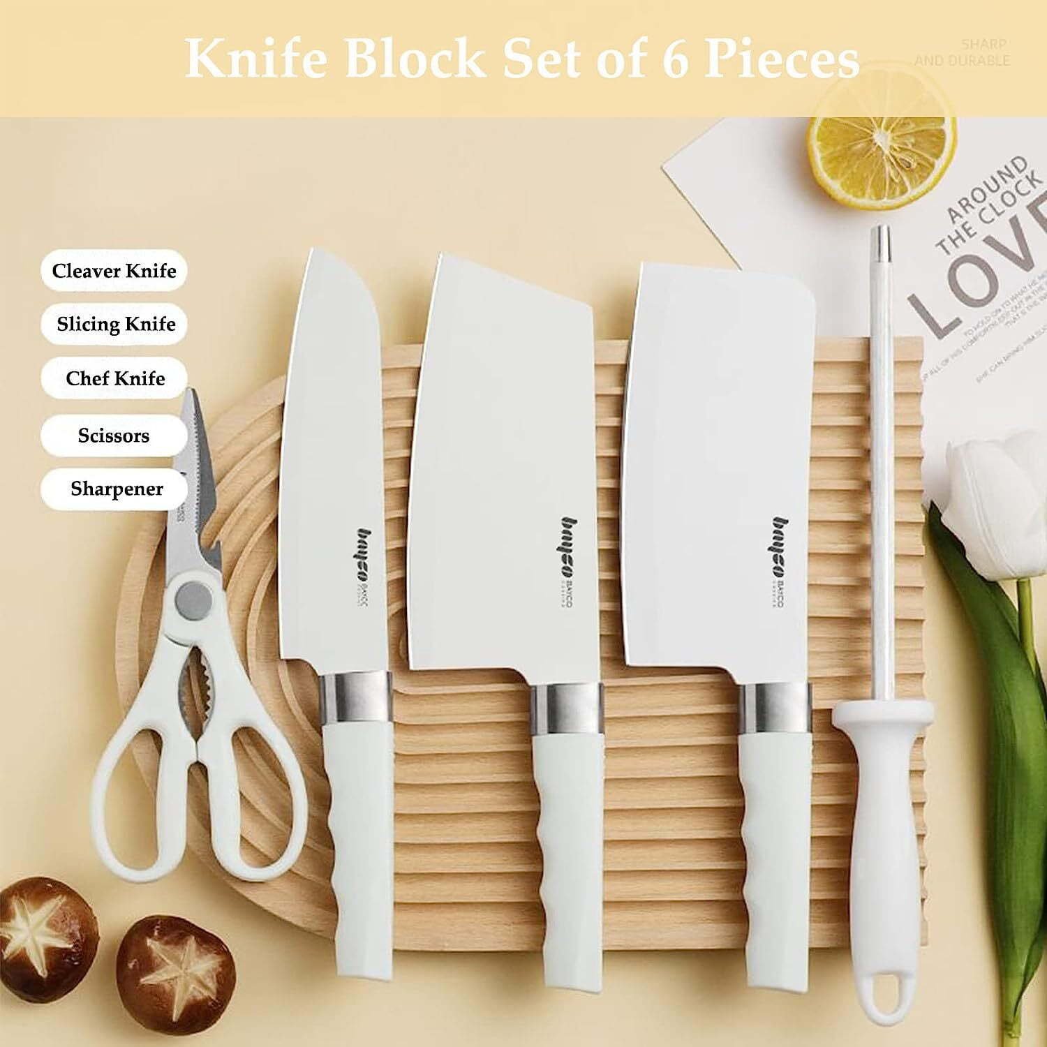 [All-In-One]This 6-piece set of white multifunctional kitchen knives includes: cleaver knife, slicing knife, chef knife, scissors, sharpener, knife block. All-in-one multifunctional kitchen knife set, fully meet the daily kitchen cutting needs and help you easily complete kitchen cooking tasks.