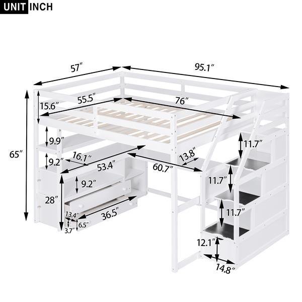 Full Size Loft Bed with Desk and Shelves, Two Built-in Drawers, Storage Staircase, WhiteThis full size loft bed with desk, shelves and drawers is a simple and stylish bed frame that coordinates well with a variety of decor styles, allowing you to elevate and enhance your space with ease. Staircase can ensure that you can reach the upper bunk safely, and can also provide storage space for your items. Made of solid solid pine wood with strong support slats, this bed is durable and sure to accompany you for many years to come. What's more, it's a desk, shelf and two large storage drawers all in one.DescriptionMaterialPine Wood+MDFSizeFullColorWhiteNumbers of Package3Spring boxNo needAssembly RequiredYesOriginVietnamDimensionsOverall Product Dimension95.1''L*57''W*65''HPackage DimensionPlease refer to the SpecificationBed Dimension76''x 55.5''Total height65''Overall Product Weight295.5lbLoft Bed Weight Capability350lbRecommend Mattress thickness6''[Multifunctionl Design]This loft bed includes a desk, shelves storage staircase and two large storage drawers in one.Not only provides you with a place to work or study, but also provides a large storage space.[Maximized Space] The full loft bed can save plenty of room for you to place other furniture in your bedroom. This bed provide ample storage for your everyday items.[Sturdy Frame] The bed structure is crafted from high-quality solid pine wood, solid pine legs and a strong, durable frame so that the bed is sturdy and durable.[Safety Guaranteed] Solid wood slats blend naturally into the already sturdy frame to give added ground-up support that provides stability.The loft bed features guard rails for added safety, and is accessible via the sturdy, slanted staircase. Enjoy many long years of relaxation and family fun, secure in this meticulously designed wood loft bed.[No Box Spring Needed] The wood slats support the mattresses not to slide and increase the service life.
