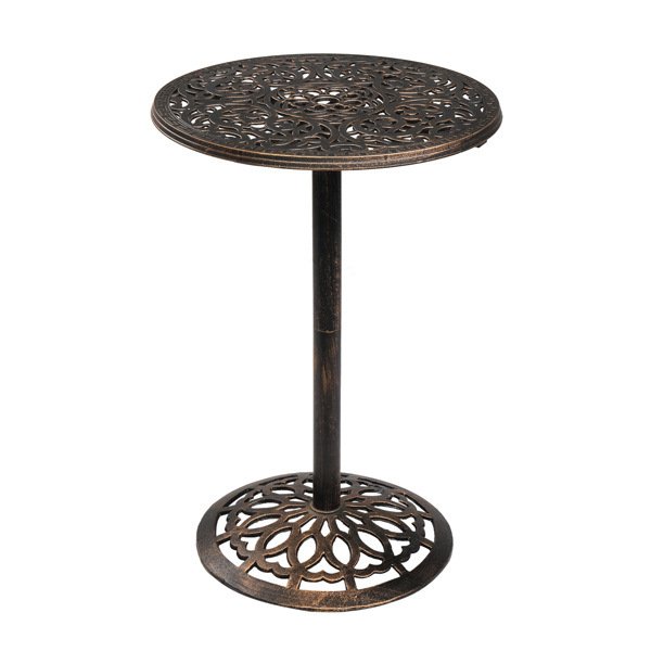 Create a picturesque outdoor oasis with this stunning pub table and immerse yourself in the allure of outdoor dining and relaxation with this Outdoor Bistro Pub Table. The round tabletop features a stunning hollowed floral pattern, adding a captivating artistic element to your patio or backyard. The antique bronze finish lends a vintage appeal, while the bar height design creates an intimate setting for enjoying drinks and conversations. Crafted with a durable cast aluminum tabletop and a sturdy steel base, this table is built to withstand the elements and provide long-lasting beauty.