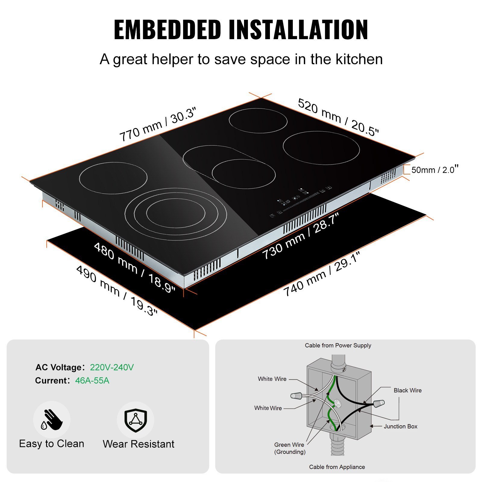 Highlights: 1.Separate Cooking Zones: Our ceramic cooktop features 5 independent cooking zones with a total power of 8600W. The surface of our radiant cooktop is made of glass, ensuring that it is heat-proof and easy to clean. Besides, the body has excellent heat dissipation and is sturdy & durable for long-term usage. This cooktop is your best choice for a high-quality cooking experience. 2.Digital Sensor Touch Controls: Our built-in electric stovetop has 9 heating power levels. With a temperature control, it allows you to precisely switch into different levels from boil to simmer. In addition, the 1-99min timer is equipped, making cooking easy and enjoyable. Set the power and timer and let the cooktop do the rest. This sensor touch control panel is ideal for achieving accurate cooking effects. 3.Works with Any Cookwares: It is free for you to use any cookware with this electric radiant cooktop, such as aluminum pans, copper pans, cast iron frying pans, and non-magnetic stainless steel pans. You can cook with 5 stoves simultaneously, providing more efficiency. 4.Multiple Safeguard Functions: This electric stovetop contains various functions for enhanced security. The child security lock avoids accidental touching, while the overheat protection and auto shut-off function keep you from unexpected dangers. No high-frequency radiation allows you to use it with confidence. In addition, when high heat remains on the surface, the residual heat reminder will indicate you, averting hand scald during cleaning. 5.Built-in Design: With the 29.1x19.2-inch cutout size, this 30.3x20.5 inch cooktop adopts a built-in design, convenient for you to install and saves your kitchen space. Suitable for voltages of 220-240V, 50/60Hz.